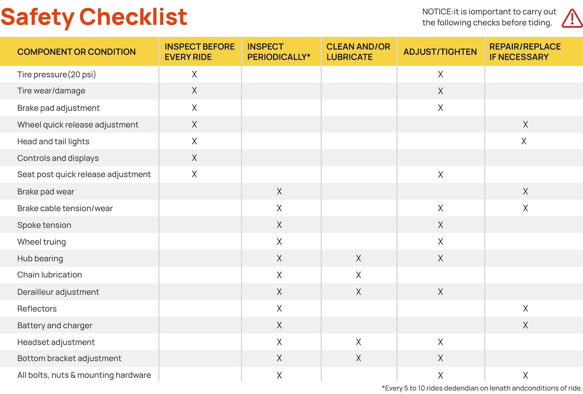 NOTICE: Before every ride, it is important to carry out the following safety checks.